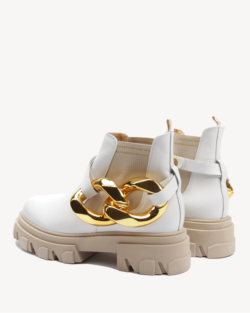 Oryginalne, biale botki damskie na masywnych, bezowych podeszwach (4 cm) z lekkiego tworzywa. To one nadaja im pozadany, modny charakter. Wsuwane cholewki wykonano z licowej skóry i zaopatrzono w symetryczne, elastyczne wstawki, które ulatwia zakladanie. Dodatkowa ozdoba botków sa zapinane wokól kostek paski z duzymi, zlotymi klamrami. Mozna latwo je zdjac, zmieniajac charakter obuwia na mniej ekstrawagancki. Dla wygody podczas noszenia botki posiadaja wewnatrz skórzane podszewki i wysciólki. Mozna z powodzeniem nosic je na co dzien, tworzac nowoczesne stylizacje.