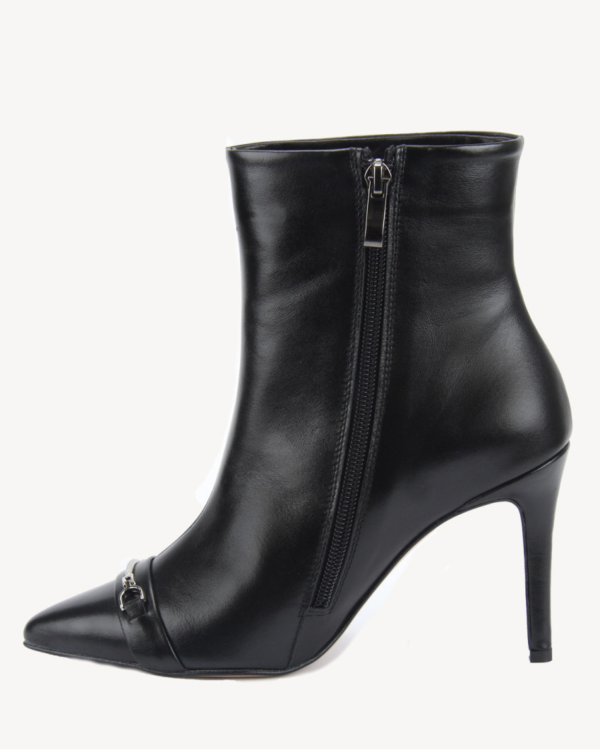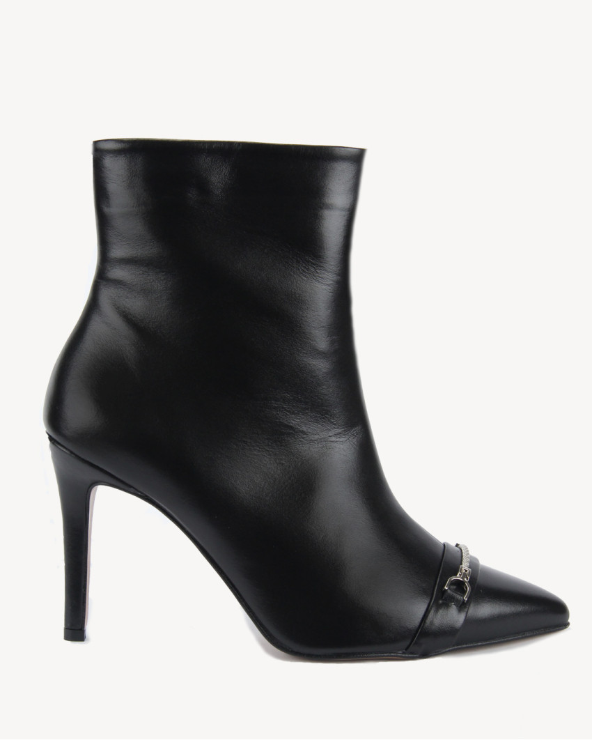 Kobiece botki na szpilce z naturalnej skóry licowej, na wysokim, 9cm obcasie. Cholewka nad kostkę i wygodny zamek z boku botka oraz ocieplenie wewnątrz buta sprawiają, że buty są idealne na sezon jesień/zima. Skóra naturalna typu zamsz, dzięki odpowiedniej konserwacji oraz impregnacji jest łatwa w utrzymaniu a buty z pewnością będą dobrze się prezentować przez więcej niż jeden sezon. Ozdobny łańcuch na wydłużonym w szpic nosku buta, nadają tym zamszowym botkom Botimo, niezwykle eleganckiego kobiecego i ultra eleganckiego charakteru. Z pewnością buty te zaliczają się do kategorii - eleganckie obuwie damskie ze skóry naturalnej.