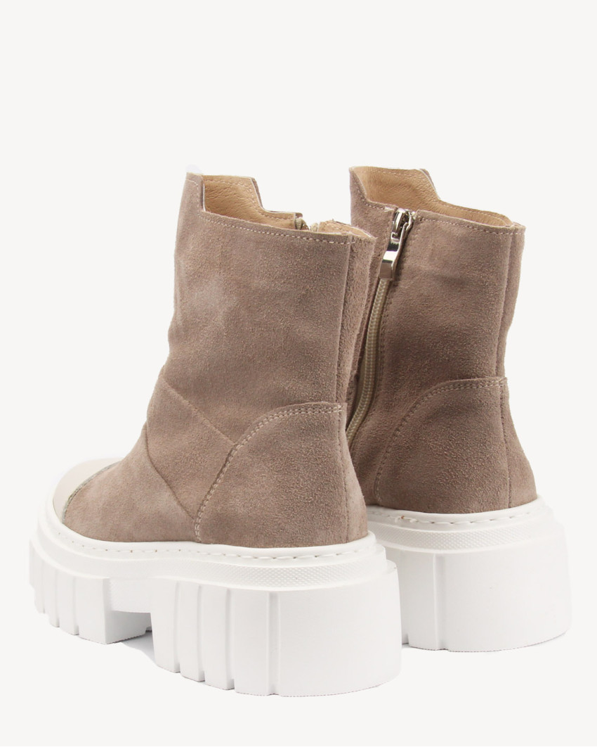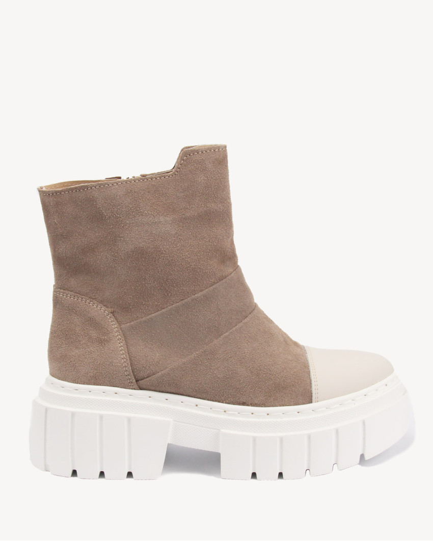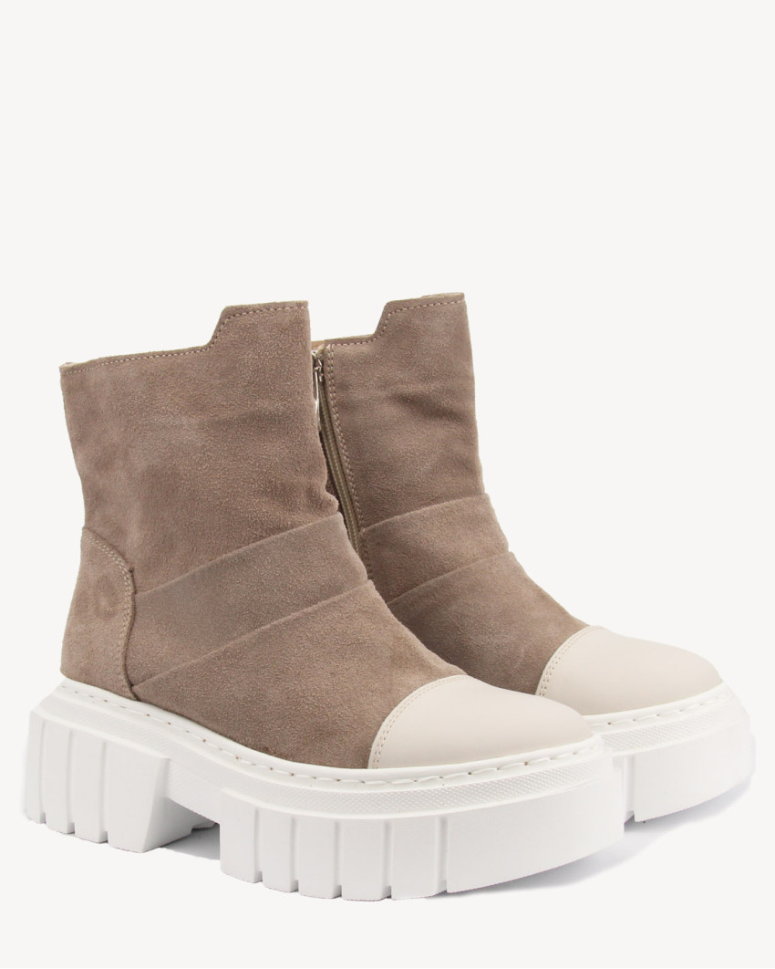 Brązowe botki Botimo ze skóry naturalnej typu zamsz, na masywnej podeszwie, platformie w czarnym kolorze. Wysoka, szersza cholewka nadaje butom kobiecego charakteru, pomimo ich masywnego designu. Skórzane botki na jesień Botimo, to idealna propozycja dla kobiet ceniących sobie świetną jakość oraz wygodę. Szeroki nosek, wzmocniony gumą oraz wygodny zamek z boku, to dobre rozwiązanie na każdą stopę. Skóra naturalna, to produkt wysoko elastyczny, co powoduje, że dodatkowo dobrze układa się na stopie, dopasowując się do jej kształtów. Skórzane bikery Botimo w jasnym odcieniu mają wysokość za kostkę a ich środek delikatnie ociepliliśmy futrówką licową, dzięki temu botki są odpowiednie na sezon jesień/zima. Odpowiednio zaimpregnowana skóra naturalna jest wodoodporna. Fason botków jest uniwersalny a dobrze dobrana rozmiarówka, sprawia, że są to buty odpowiednie zarówno dla młodzieży jak i dla dojrzałych kobiet. Gwarantujemy najwyższą jakość obuwia Botimo. Dodatkowo każda zakupiona u nas para posiada 2 letnią gwarancje producencką.