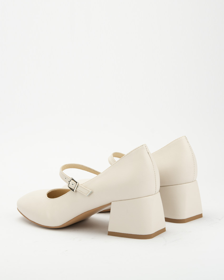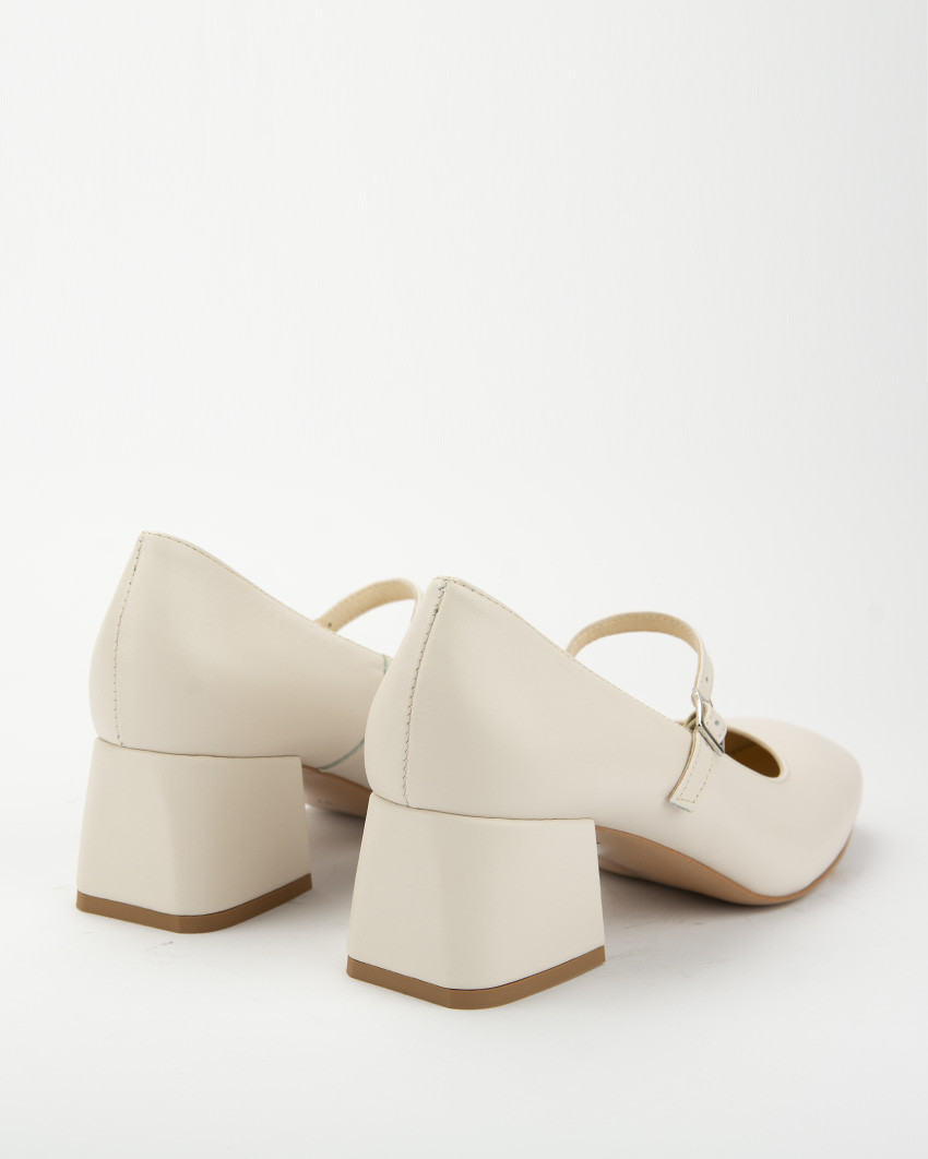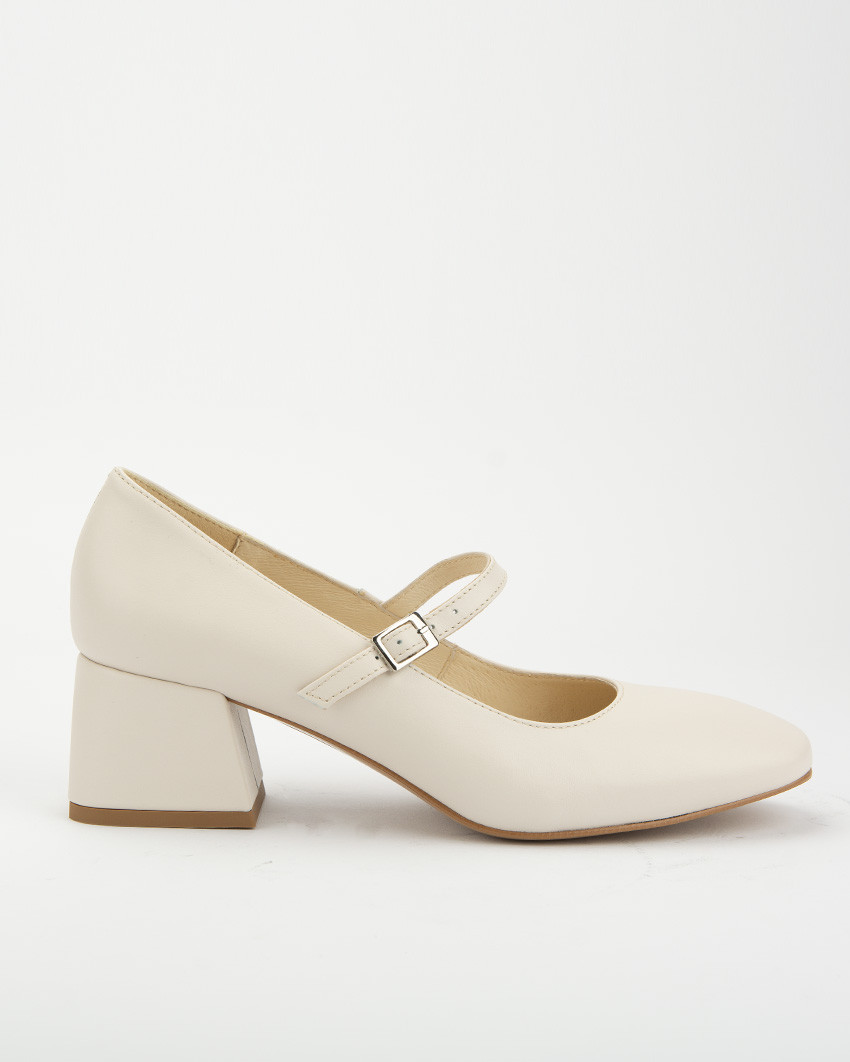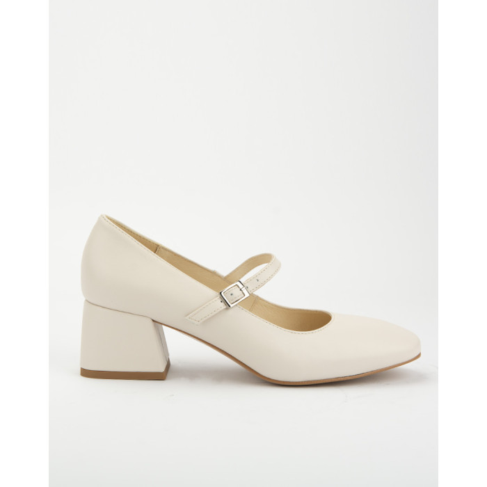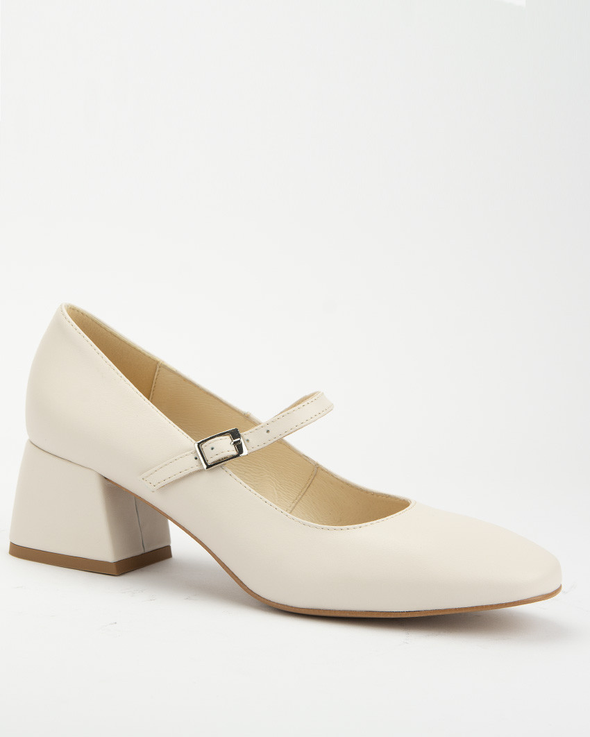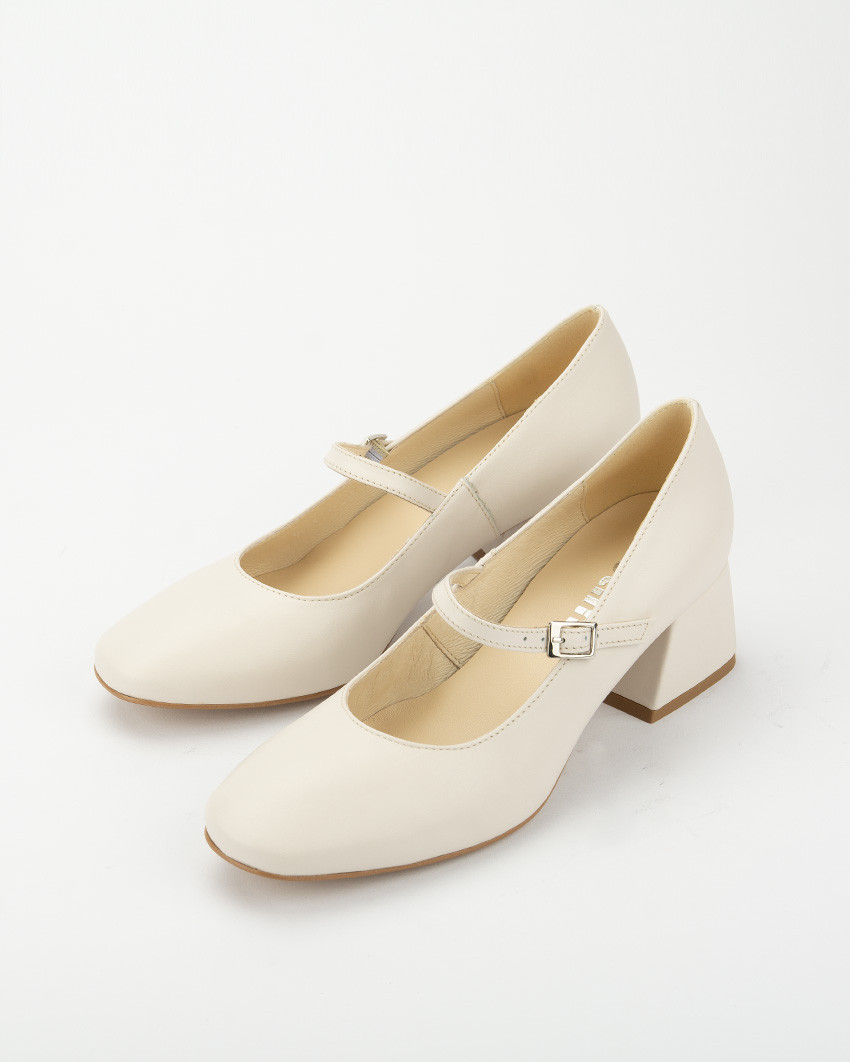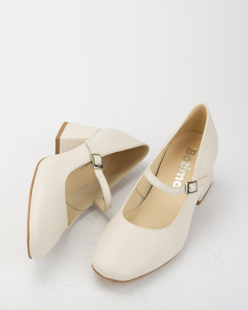 Jasnobeżowe czółenka "Mary Jane" ze skóry naturalnej, licowej. Niski, szeroki obcas oraz zapięcie na elegancki, cienki pasek mocowany na gumce dla większego komfortu noszenia, nadają butom bardzo klasycznego charakteru. Stabilny, szeroki obcas oraz miękka, skórzana wkładka zapewniają wysoki poziom wygody. Skóra naturalna jest elastyczna co oznacza, ze but dopasowuje się do stopy. Lakierowane czółenka damskie Botimo ze skóry naturalnej, to idealna propozycja do biura, na uczelnie ale także na wieczorne wyjścia. Fason Mary Jane to klasyka retro stylu. Świetnie się prezentują zarówno ze spodniami z prostą nogawką jak i z klasycznymi jeansami, ze spódnica mini czy elegancka sukienka.