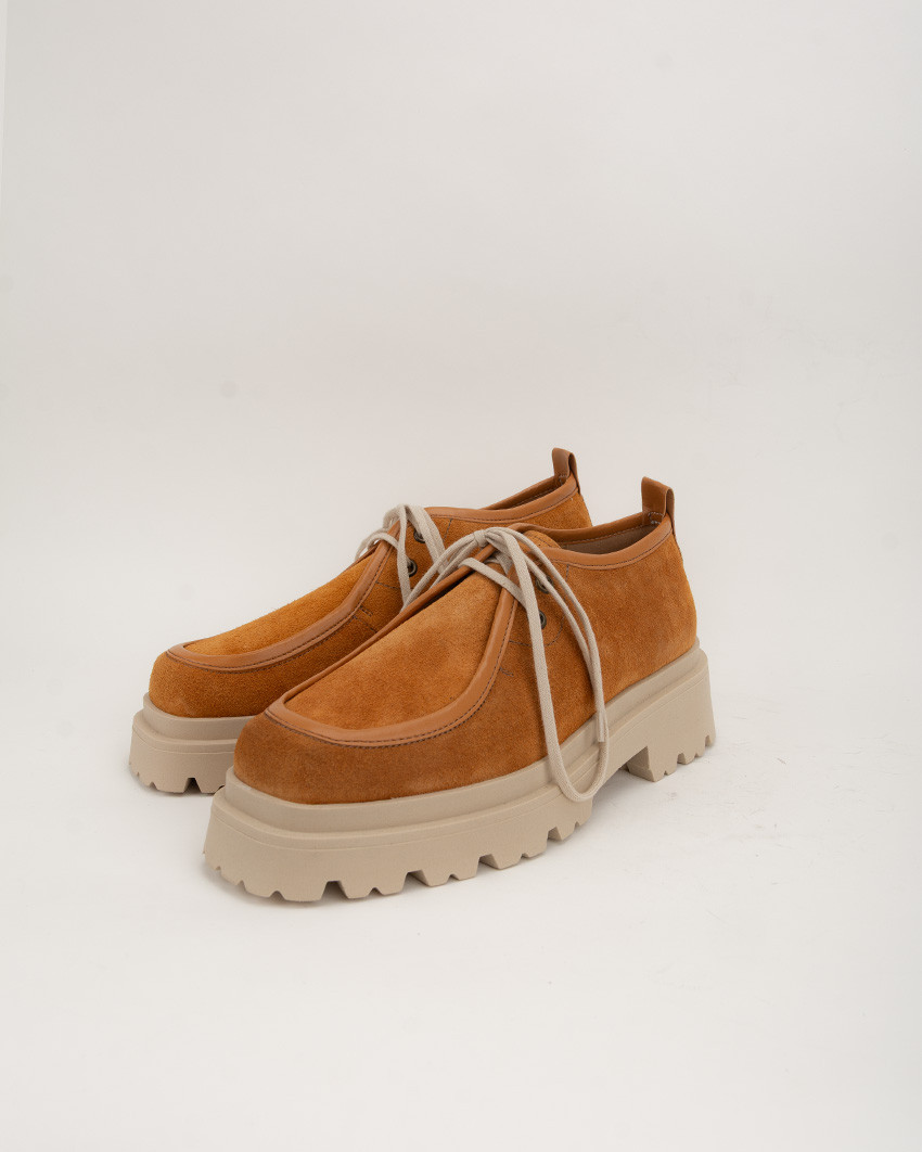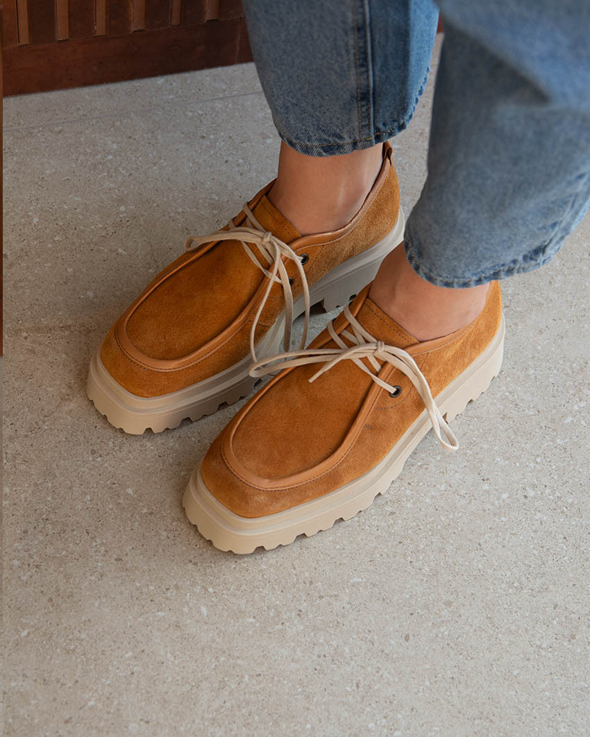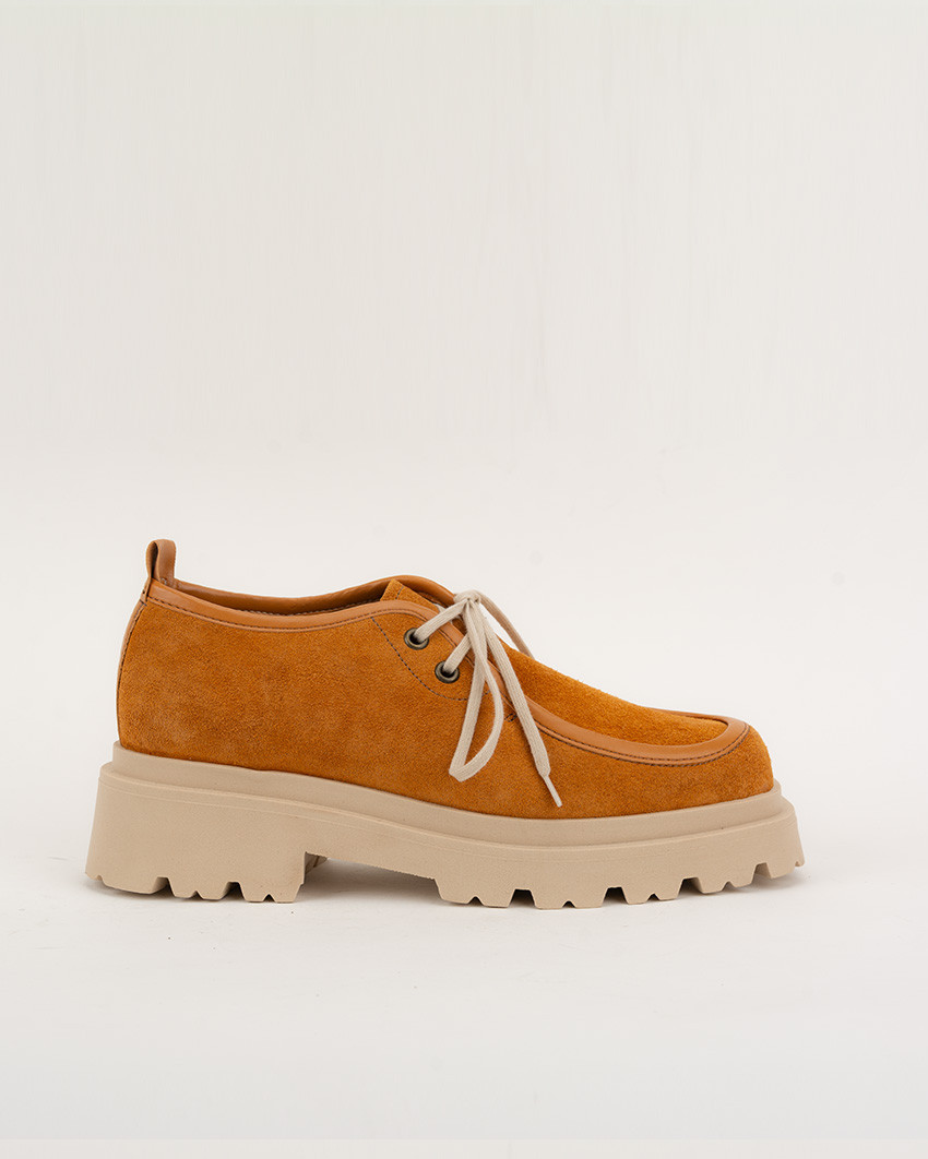 Sznurowane półbuty Hana z kwadratowym czubkiem i na platformie. Uszyte z miękkiej, zamszowej skóry naturalnej idealnie dopasowuje się do stopy. Skórzana wkładka zapewnia optymalną wentylację. Wyższa podeszwa dobrze amortyzuje od podłoża, jednocześnie nie obciążając stopy.