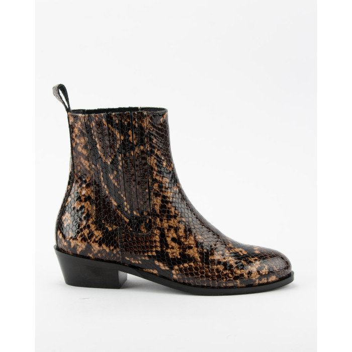 Wężowe botki damskie za kostkę, stylizowane na kowbojki, wygodne sztyblety. Skóra naturalna w zwierzęcy deseń HIT! Botki model Arizona na niskim obcasie o typowym skosie. Charakterystyczny wydłużony ale zaokrąglony nosek, cholewka z wszytymi gumkami. Niskie kowbojki Arizona Botimo to obuwie w jakości premium. Wykonanie ze skóry naturalnej gwarantuje trwałość botków oraz łatwa konserwacje. Dobrze zaimpregnowana skóra naturalna jest wodoodporna a zamsz bardziej odporny na zabrudzenia. Te klasyczne kowbojki ze skóry naturalnej to propozycja dla kobiet śledzących trendy modowe oraz takich, które cenią sobie obuwie damskie wysokiej jakości.