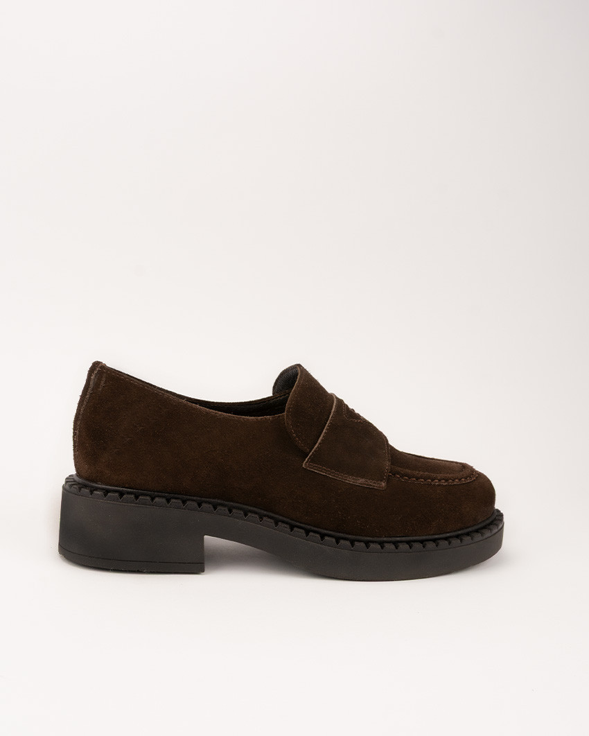 Klasyczne loafersy damskie z pięknej skóry zamszowej w kolorze czekolady na 5cm grubej podeszwie. Zabudowana cholewka oraz grubsza podeszwa zapewniają komfort noszenia oraz nadają butom klasycznej elegancji. Wykonanie ze skóry naturalnej oraz miękka, skórzana wkładka, sprawiają, że te klasyczne mokasyny Botimo są bardzo wygodne, nawet wtedy, kiedy nosisz je przez cały dzień. Użycie specjalnej wkładki ze skóry naturalnej pozwala stopom „oddychać”. Dodatkowo wysokogatunkowa skóra naturalna dobrze dopasowuje się do każdego rodzaju stopy, co gwarantuje bardzo wysoki komfort noszenia. Klasyczna forma oraz wysoka jakość wykonania sprawiają, że te mokasyny nie tylko dobrze wpisują się w modowe trendy ale z pewnością nigdy z mody nie wyjdą. Skórzane mokasyny Botimo, to dobra inwestycja na lata. Odpowiednia konserwacja oraz impregnacja zapewni im świetny wygląd na długie lata.